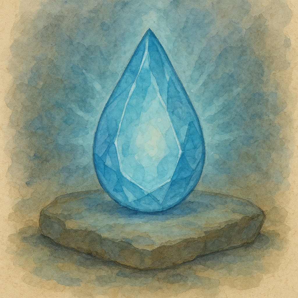 The Moon Tear is a rare sky gem (not to be confused with sky metals) which fall to Alvion every full moon (and thus approximately once per month). They are a valuable magical crafting material (treated as a Potent Magical Crafting Material, worth 25TU), which might be forged by a sufficiently skilled adventurer into a vial capable of pulling from the Goldspring or the Darkfont.